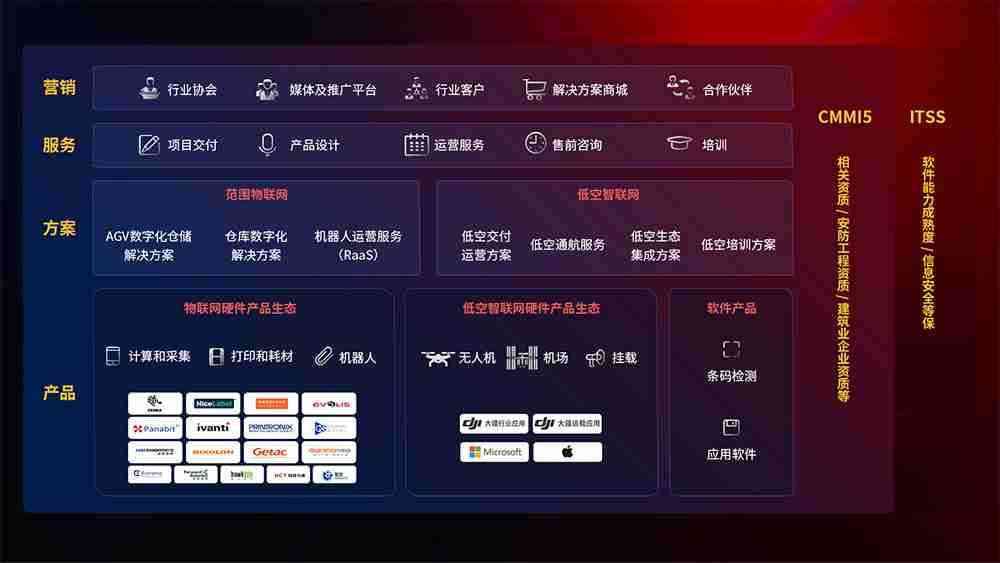 聚合国内外先进的物联网硬件产品品牌,,聚焦数字化仓储、、、、机器人运营、、、低空智联网等领域,,,共同打造适合客户业务场景的解决方案并提供交付服务